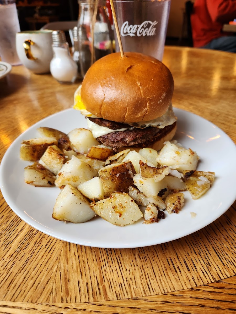 I’m so glad we finally got to try Shirley’s! It’s super cute inside with exposed brick and a wide open eating area. There’s also a bar in the back where you can sit. We got right in on a Saturday morning around 8. The server came right over for a drink orders, they have all the usual suspects. There were honestly three or four things on the menu that I wanted to try, but I settled on the veggie omelette to which I added ham for $4. We also had french toast, bacon and scrambled eggs at the table. The dishes come with gigantic homefries and toast. Service was great, food was great, and we even got to meet Shirley. We will definitely be going back. Went back today, 8/16 for the Tot Breakfast….delicious